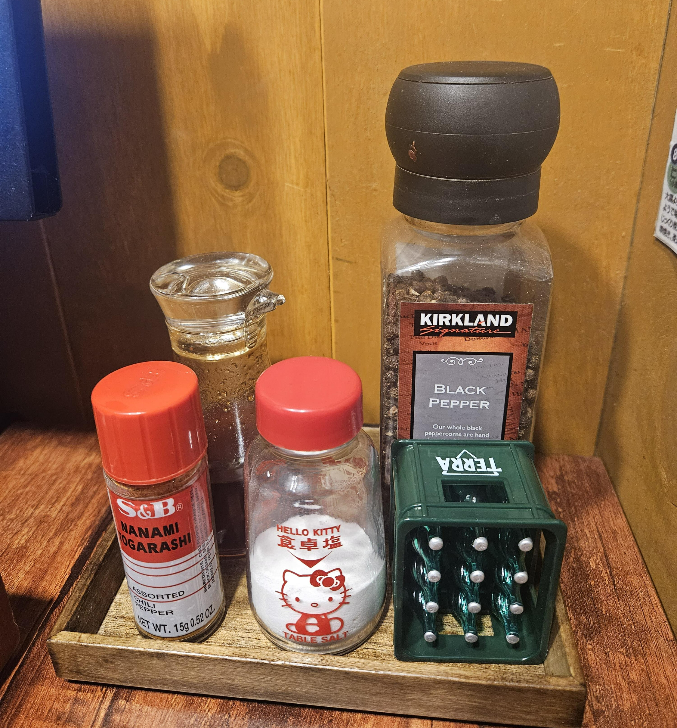 테이블 사이드에는 통후추와, 시치미, 소금 준비 되어 있고 고기와 곁들여서 먹을 수 있는 야끼니꾸 타래소스로 구성되어있어요. 귀여운 테라 맥주병따개도 있네요~