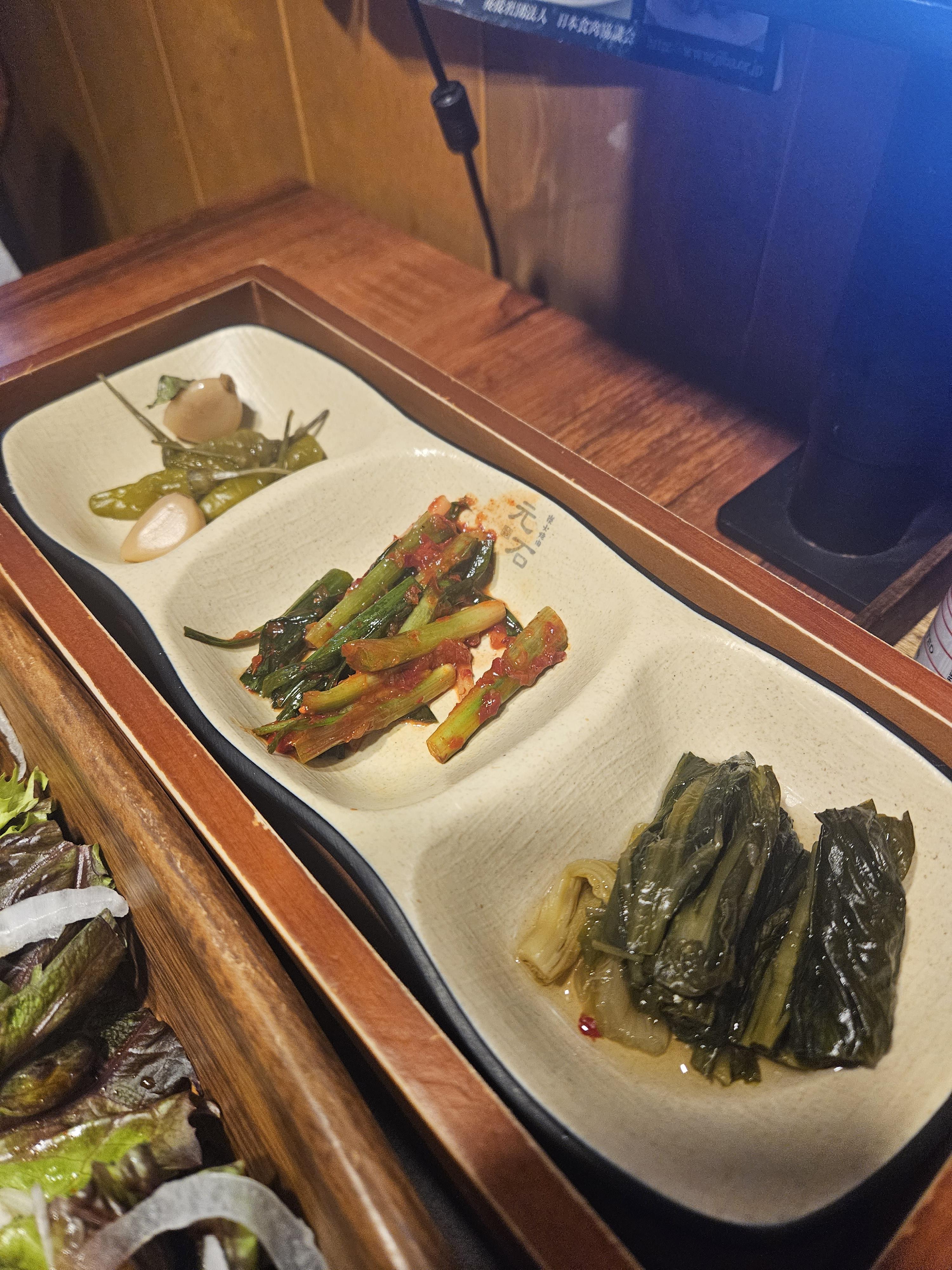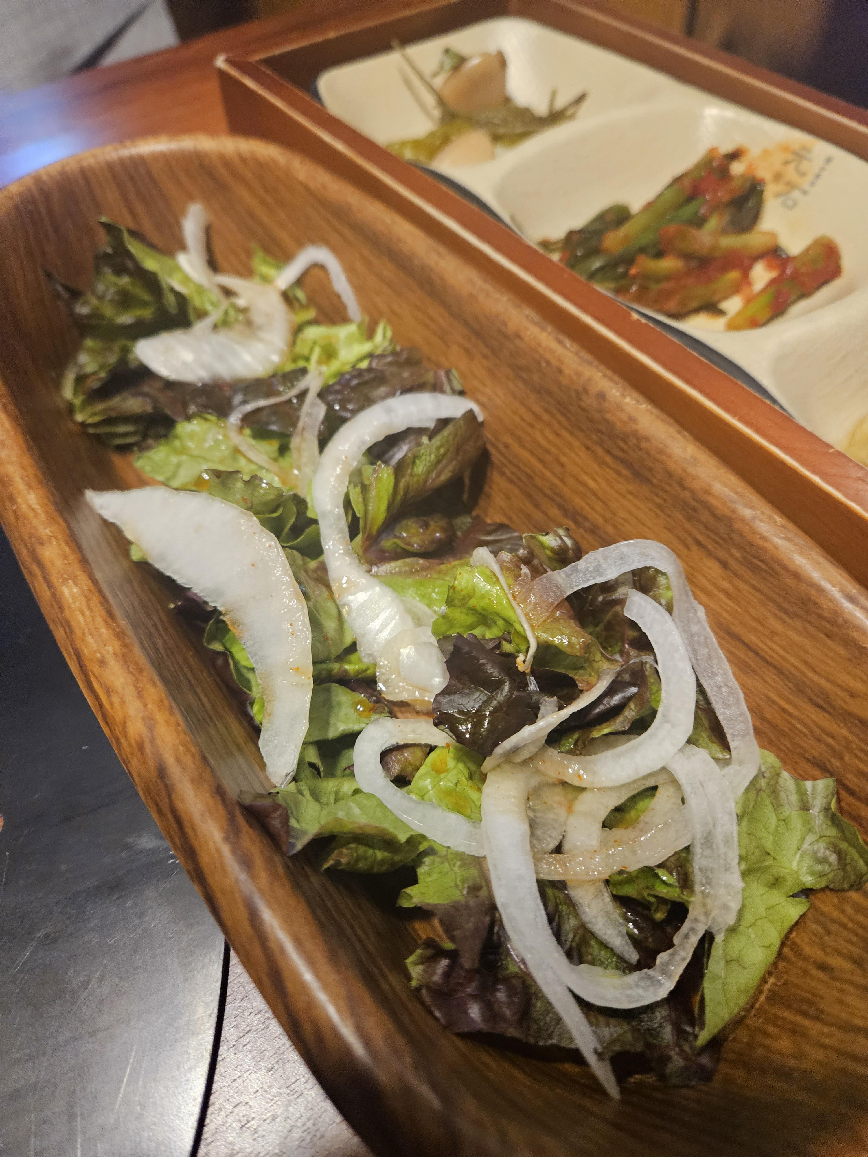 새콤했던 상추양파무침과 짱아찌류로 기본 반찬은 준비되어 나와요. 소고기는 느끼한 편인데 짱아찌들이 느끼함을 싹 잡아줘서 너무 좋았어요.