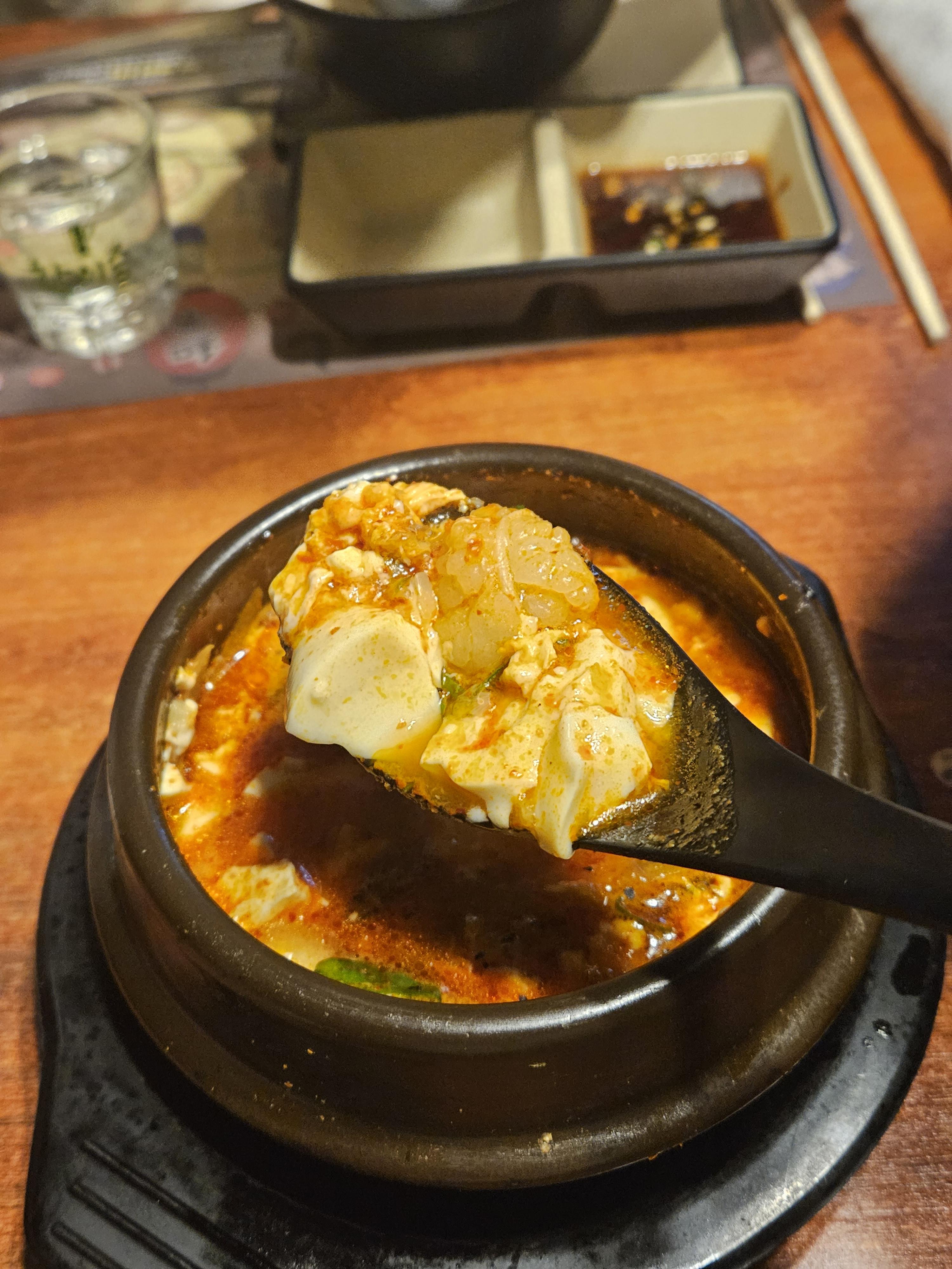 대창이 들어간 순두부 찌개를 서비스로 내어주셨는데 대창이 하나 밖에 들어가 있지 않아서 좀 아쉬웠어요! 아무튼 그래도 진짜 맛있었어요. 메인 메뉴가 나오기 전 찌개로 속을 든든하게 데우니 좋았어요
