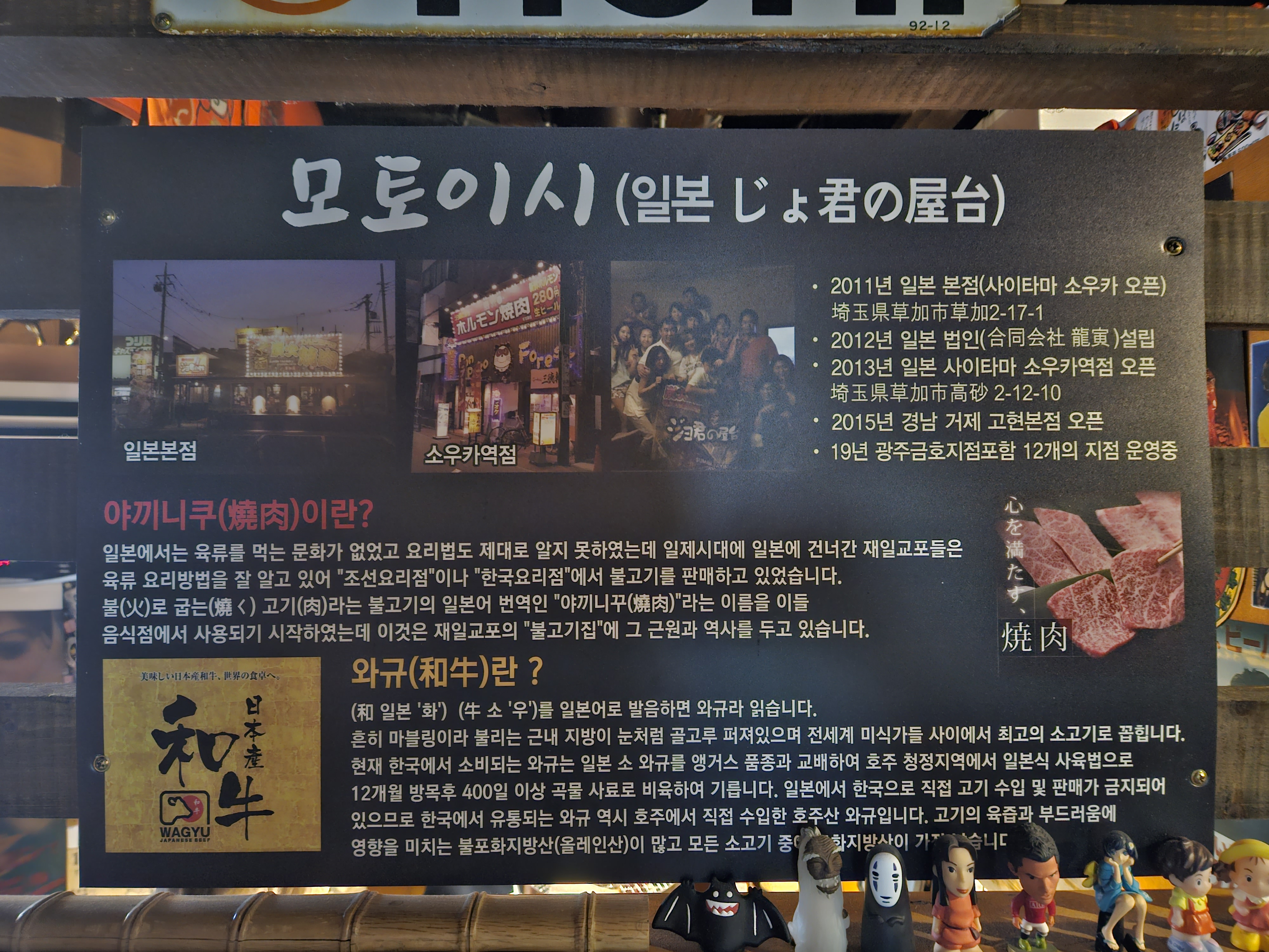 모토이시 내부도 외부처럼 한국인지 일본인지 모를 분위기를 내뿜고 있었어요. 좀 어두운 편이였고 벽 면에는 소 부위에 대한 설명이나 야끼니꾸를 어떻게 하면 더 맛있게 먹을 수 있는지 설명이 되어있는 귀여운 포스터들로 가득했어요. 포스터 구경을 하다보면 시간가는 줄 모르겠더라구요.